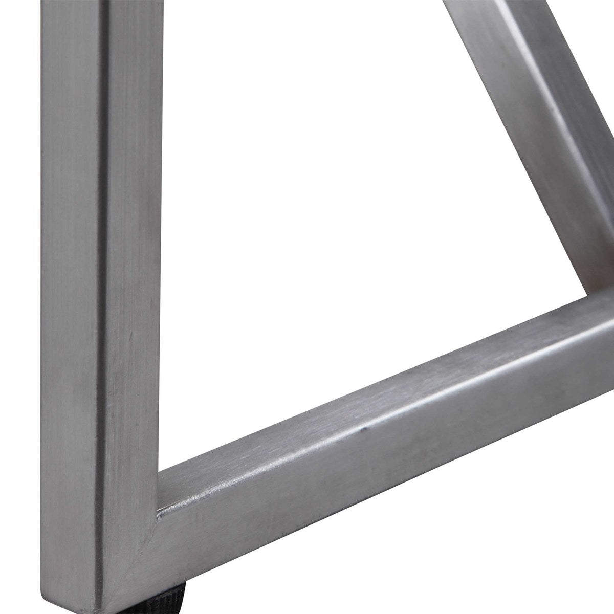 Clean contemporary styling, featuring oak veneer finished in a soft white with light gray distressing. Accented with statement hardware in brushed nickel stainless steel with a coordinating base. Has two double drawers and one single drawer in the center.